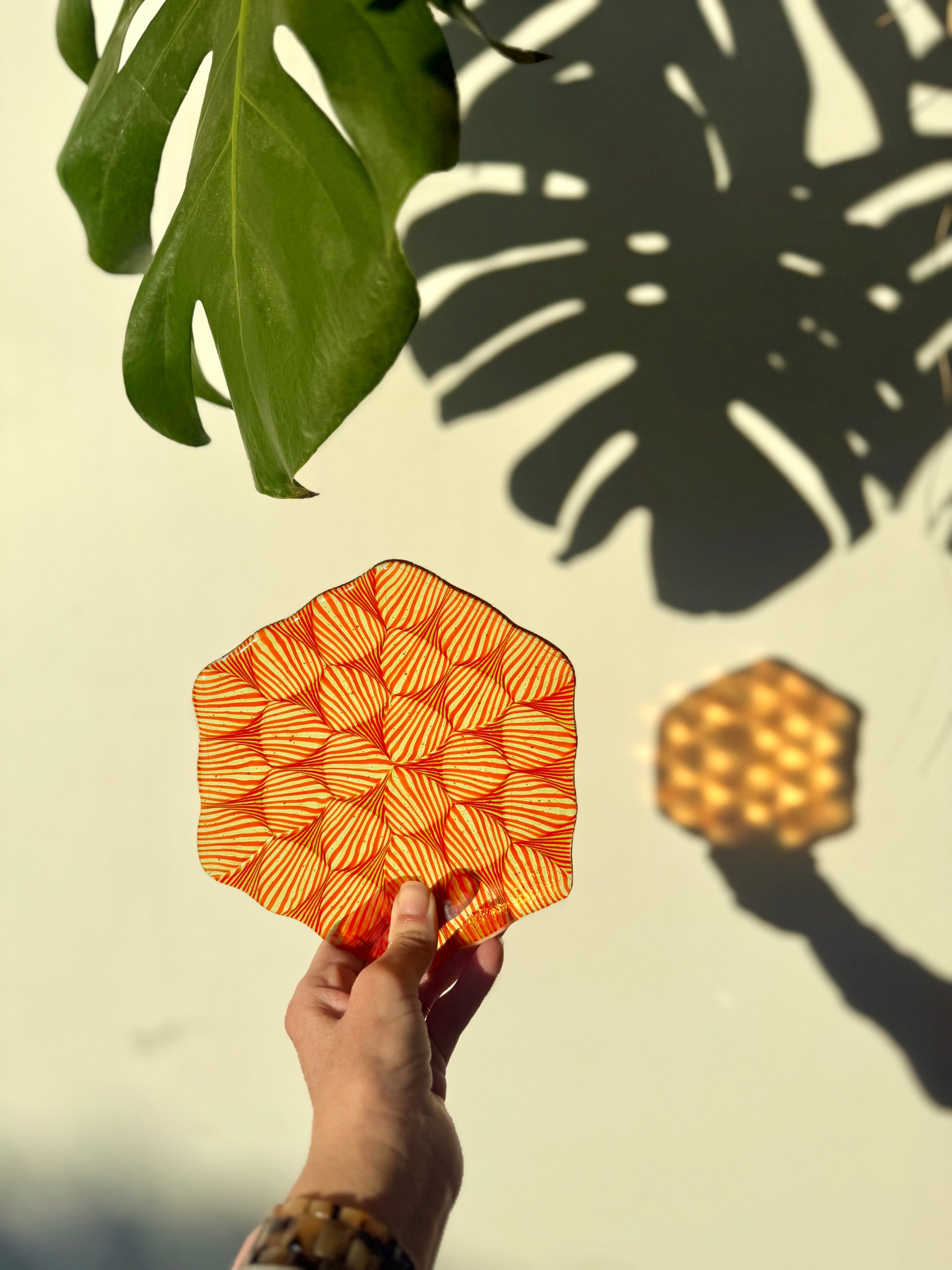 I painstakingly arranged hundreds of pieces of 1mm glass stringers to create this vibrant optic dish with repeating pattern in orange and pale green