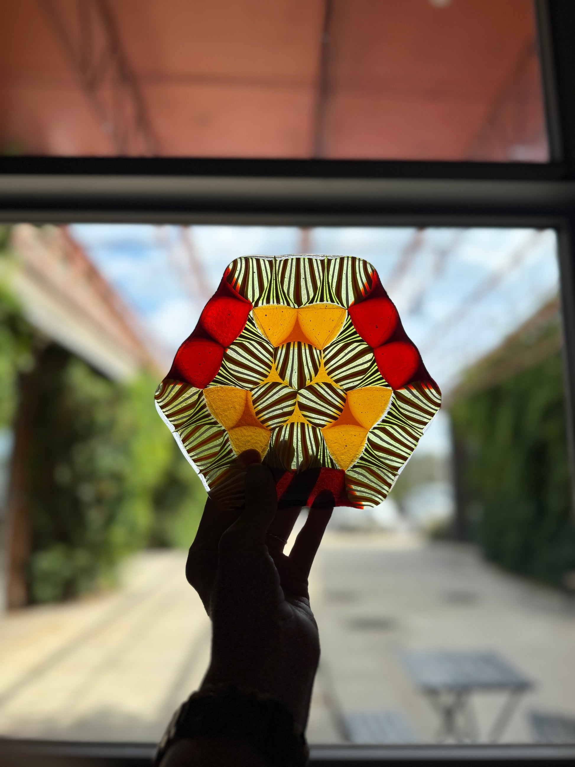 I painstakingly arranged hundreds of pieces of 1mm glass stringers to create this funky optic dish with repeating pattern that reminds me a red-eared slider turtle.