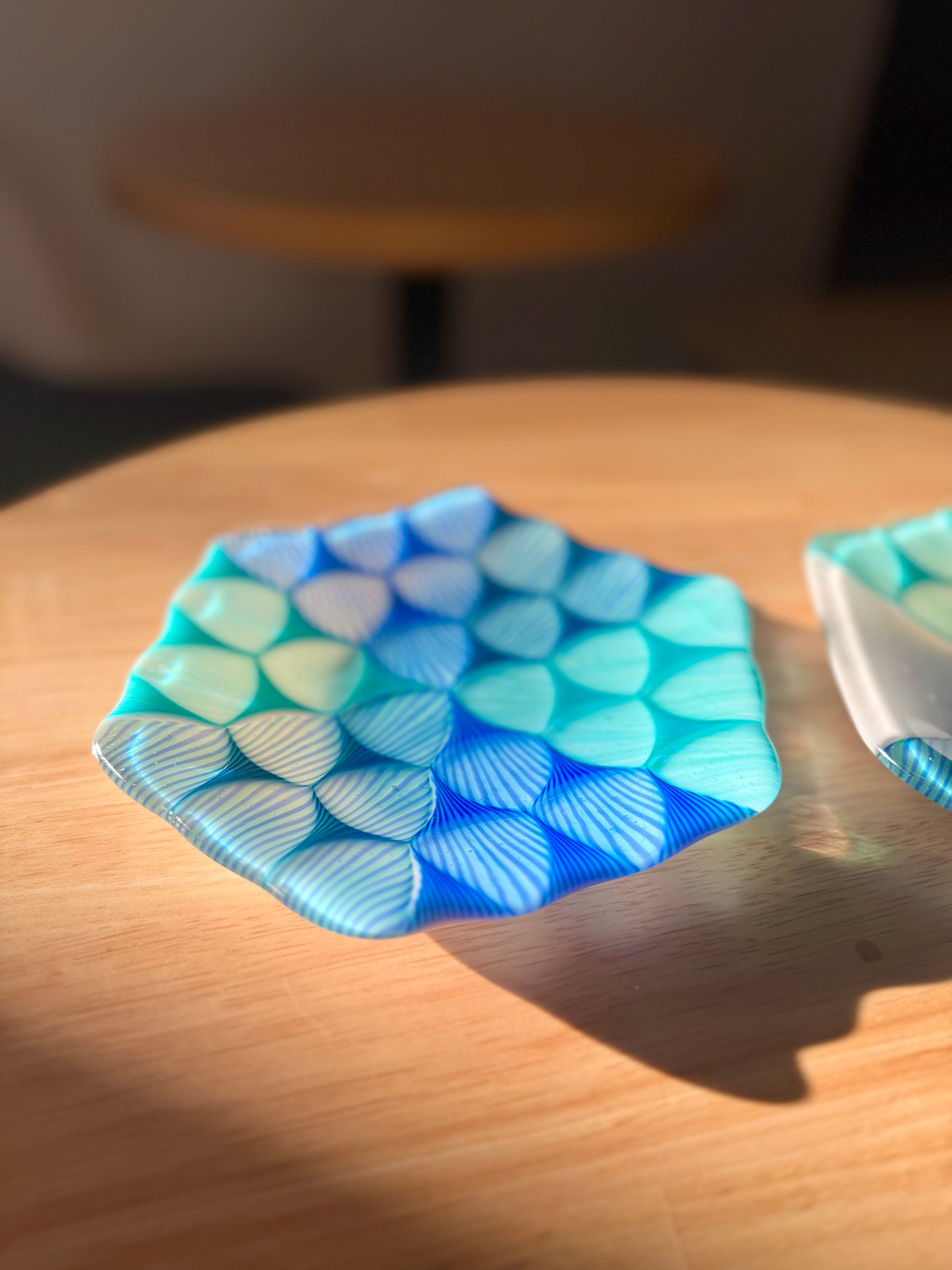 I painstakingly arranged hundreds of pieces of 1mm glass stringers to create three different pieces of glass then cut and combined them for this vibrant yet soothing optic dish with repeating pattern in shades of blue, aqua and emerald.