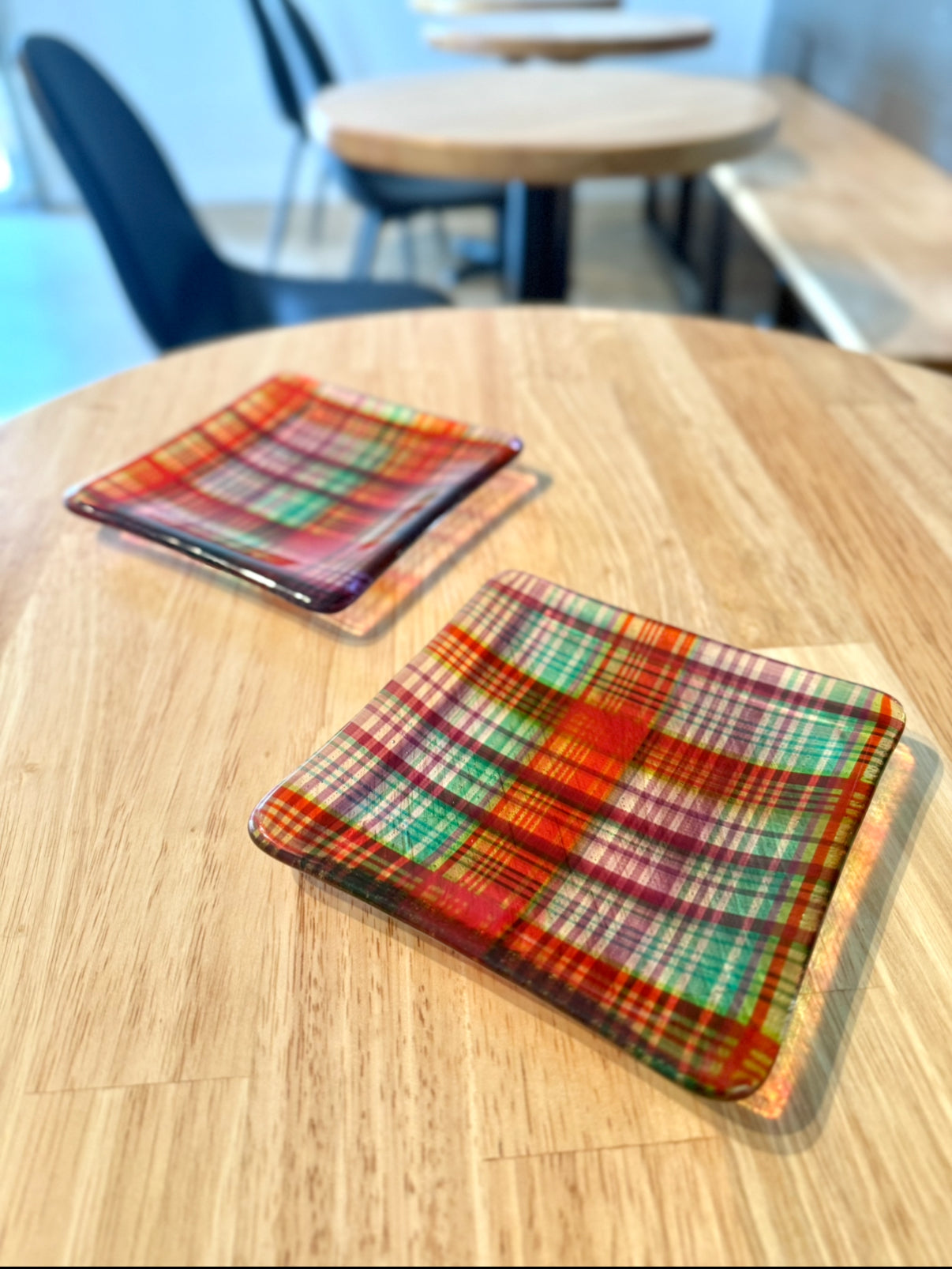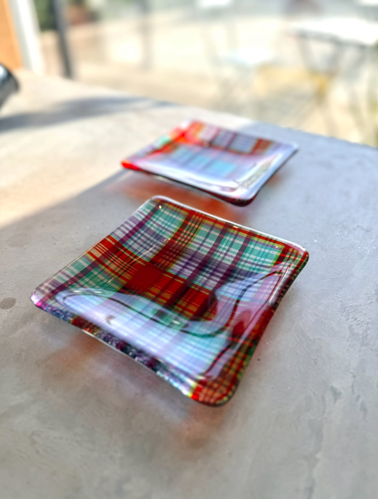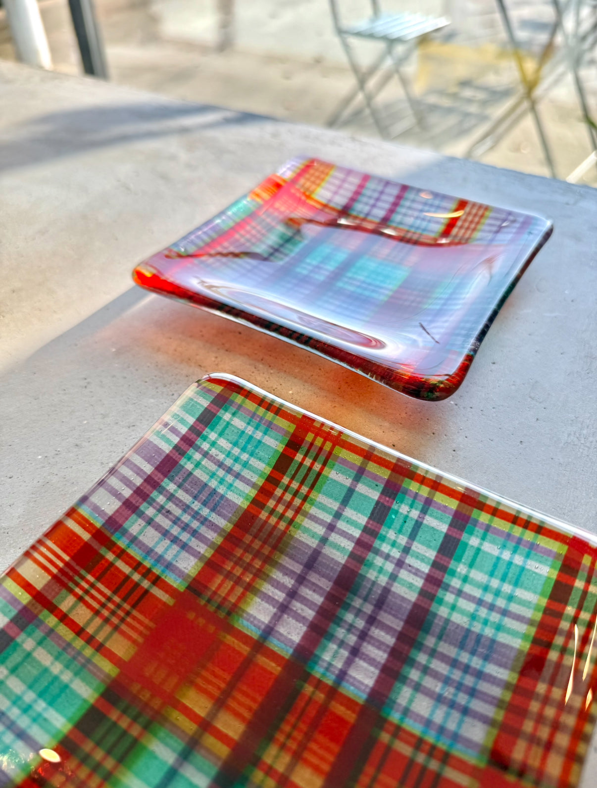 I painstakingly arranged hundreds of pieces of 1mm glass stringers to create this fun, nostalgic plaid. And unlike my optic plaid dishes, this one’s food safe!