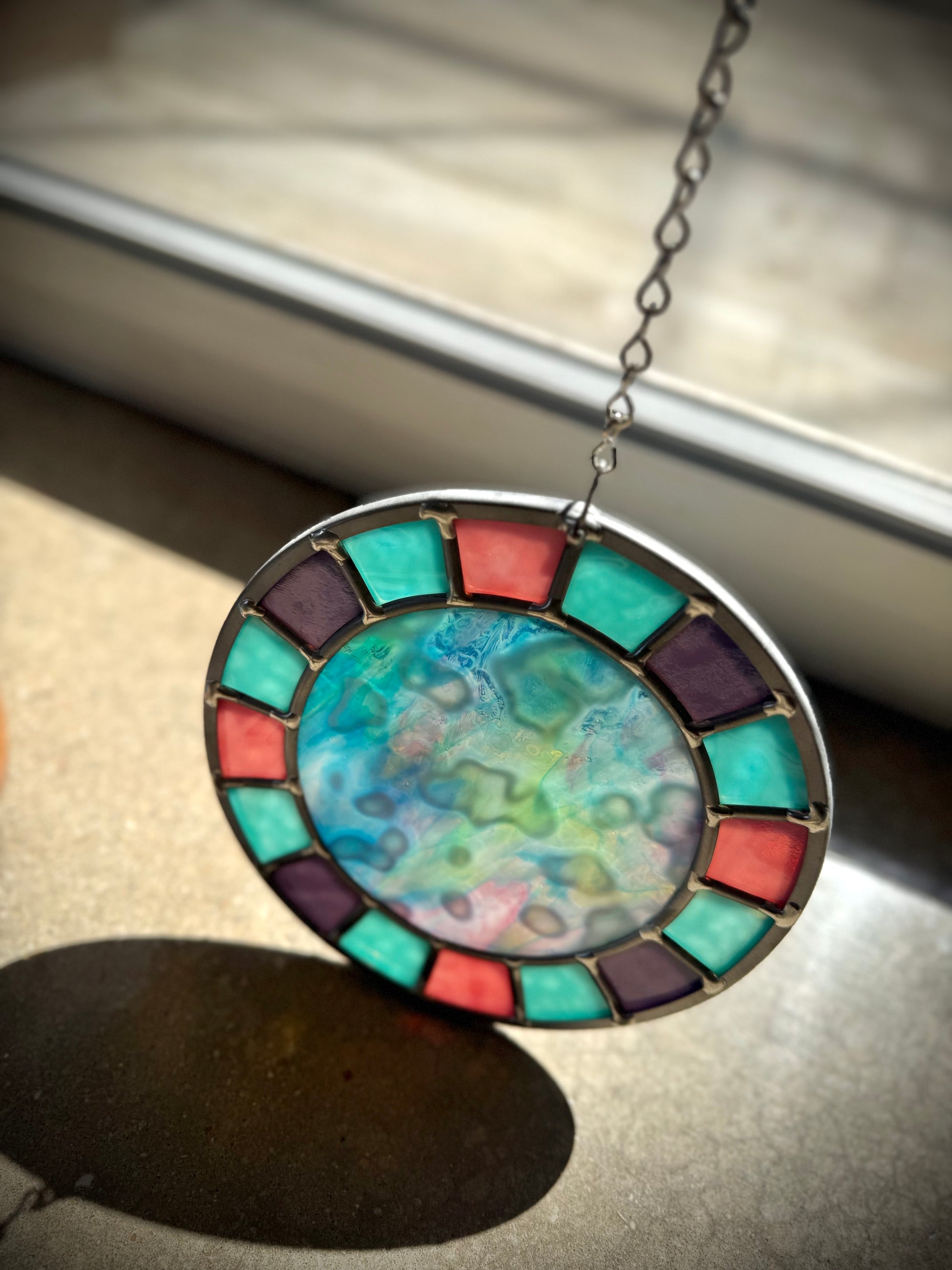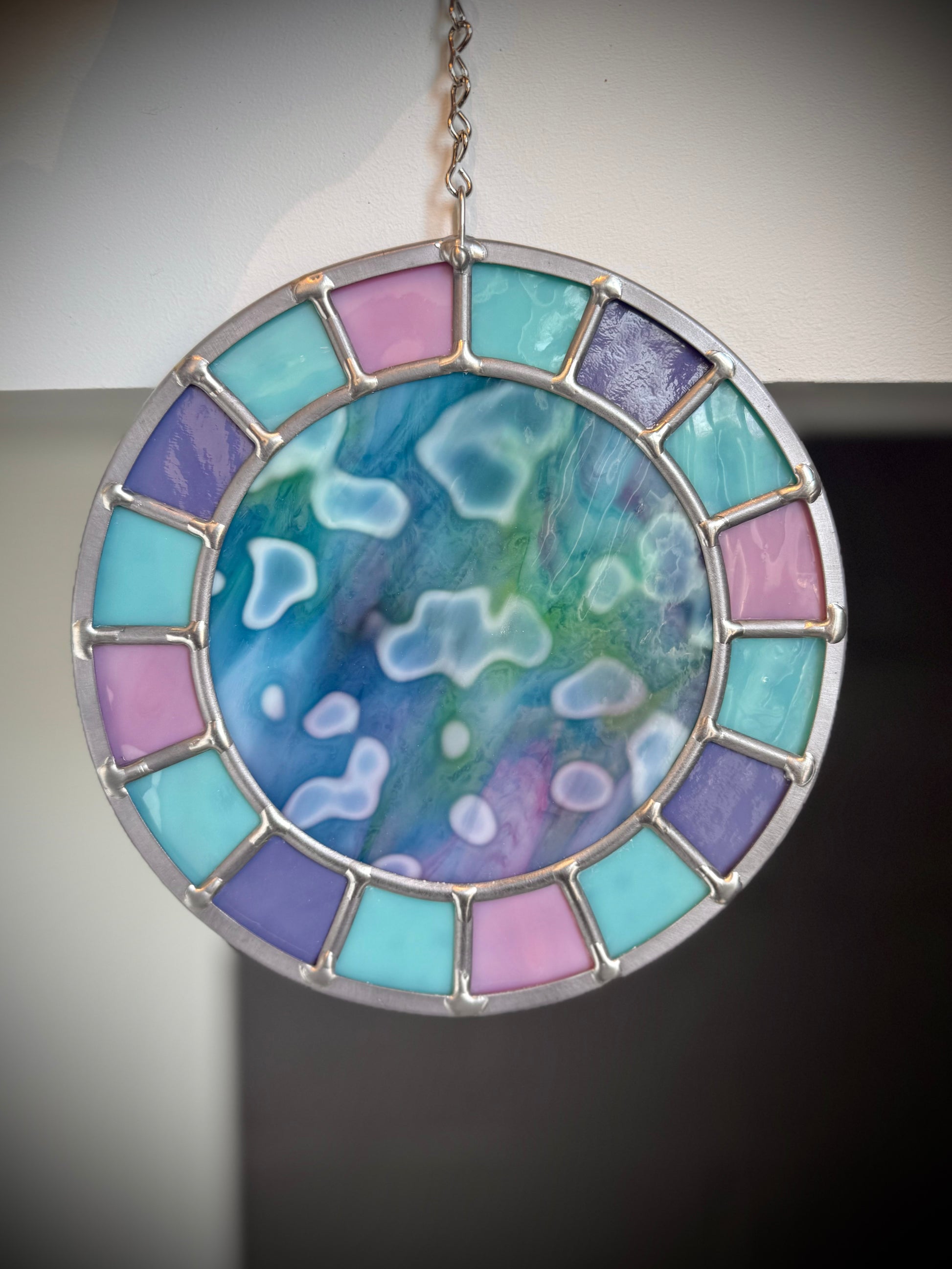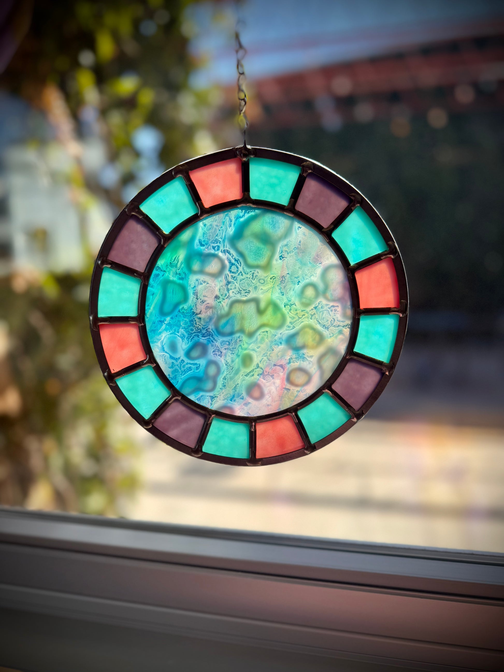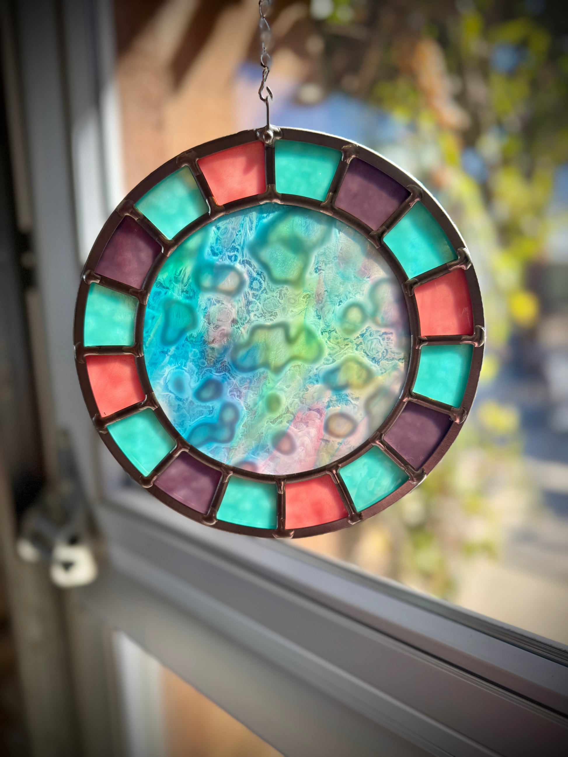 - Features candy-colored ring-mottled glass bordered by vintage glass in pink, purple and blue